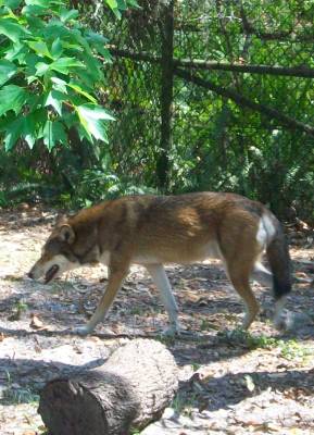 The red wolf was running all over his pen